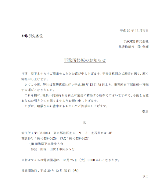 お取引先各位本日より、新事務所にて営業を開始しております。お近くにお越しの際は是非、お立ち寄り下さい。